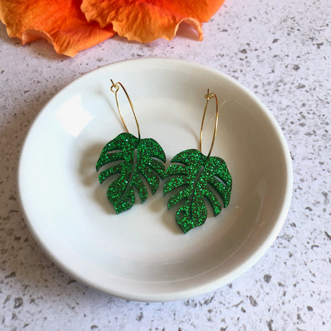 Beautiful green glitter acrylic earrings in the shape of a Monstera leaf. Choose a gold or silver hoop (shown in picture with gold hoop). Made of acrylic they just shine and amazing. Classic and pretty! The glitter Monstera Earrings on stainless steel hoops are so gorgeous! Monstera leaf is approximately 30mm long Wine Glass hoop is 25mm diameter in gold stainless steel...