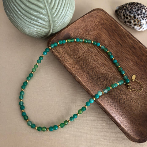 This Agate Gemstone Bead necklace with gold stainless steel spacer beads is the perfect look for layering or on its own. The mostly green and jade mixed colour gemstones make a stand out look to top off your outfit Necklace material: Agate Gemstone Beads in Jade Green colour mix with gold spacers Necklace length is approx 45cm, with 5cm extender Bead diameter: 6mm Chain and hardware is...