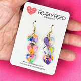 Pastel on Black is a daring earring collection. This pair of hearts on black french hooks are made with black and pastel colour swirls with a glossy resin coating.